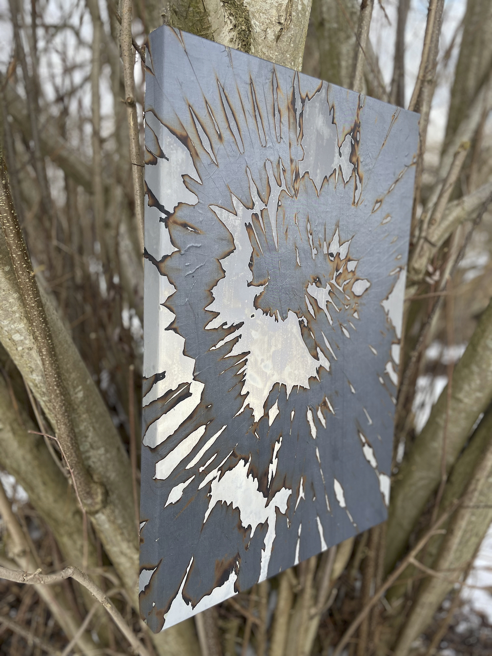 After the burning, the fabric is unfolded with precision and mounted on a backing of reflective or fiberglass material, creating a contrast between the fragile, scorched textile and the cool, industrial support. The result is a work that balances control and accident—an imprint of fire, structure and transformation.