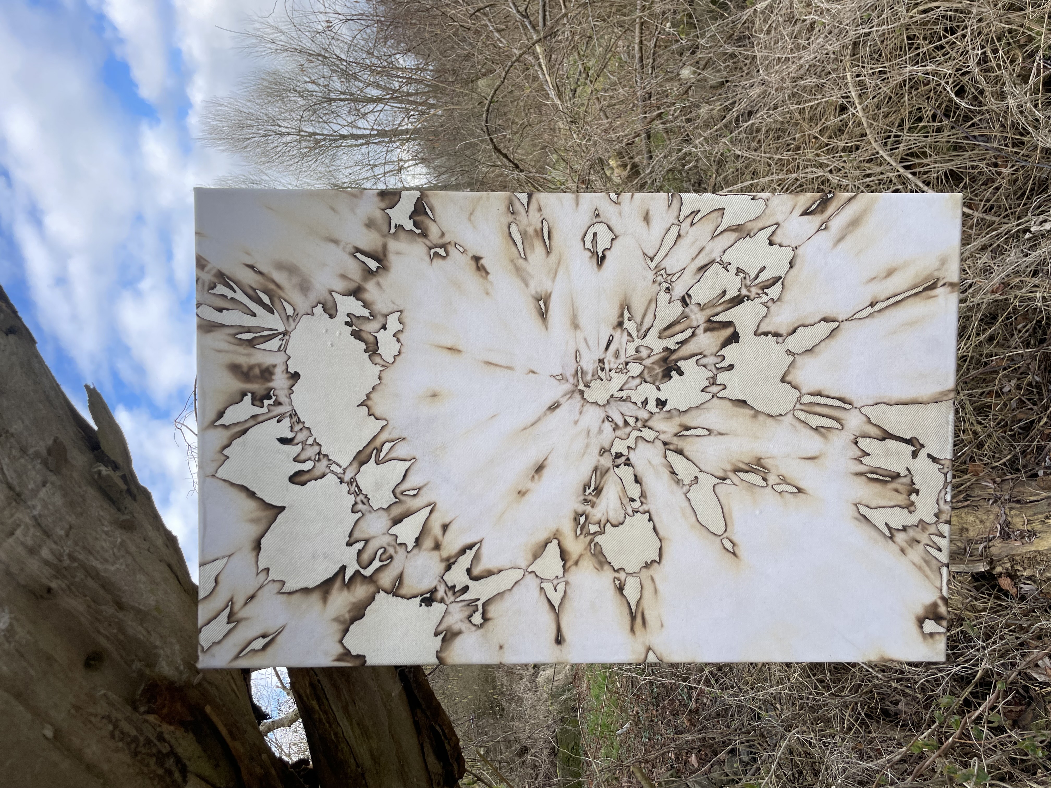 –My Fire Batik series explores the tension between control and chaos. By burning silk fabric with fire, a batik-like pattern emerges, where the burn holes represent a deliberate loss of control. Mounted on fiberglass or other synthetic materials, the contrast between the matte, scorched areas and the glossy, untouched surfaces is accentuated.