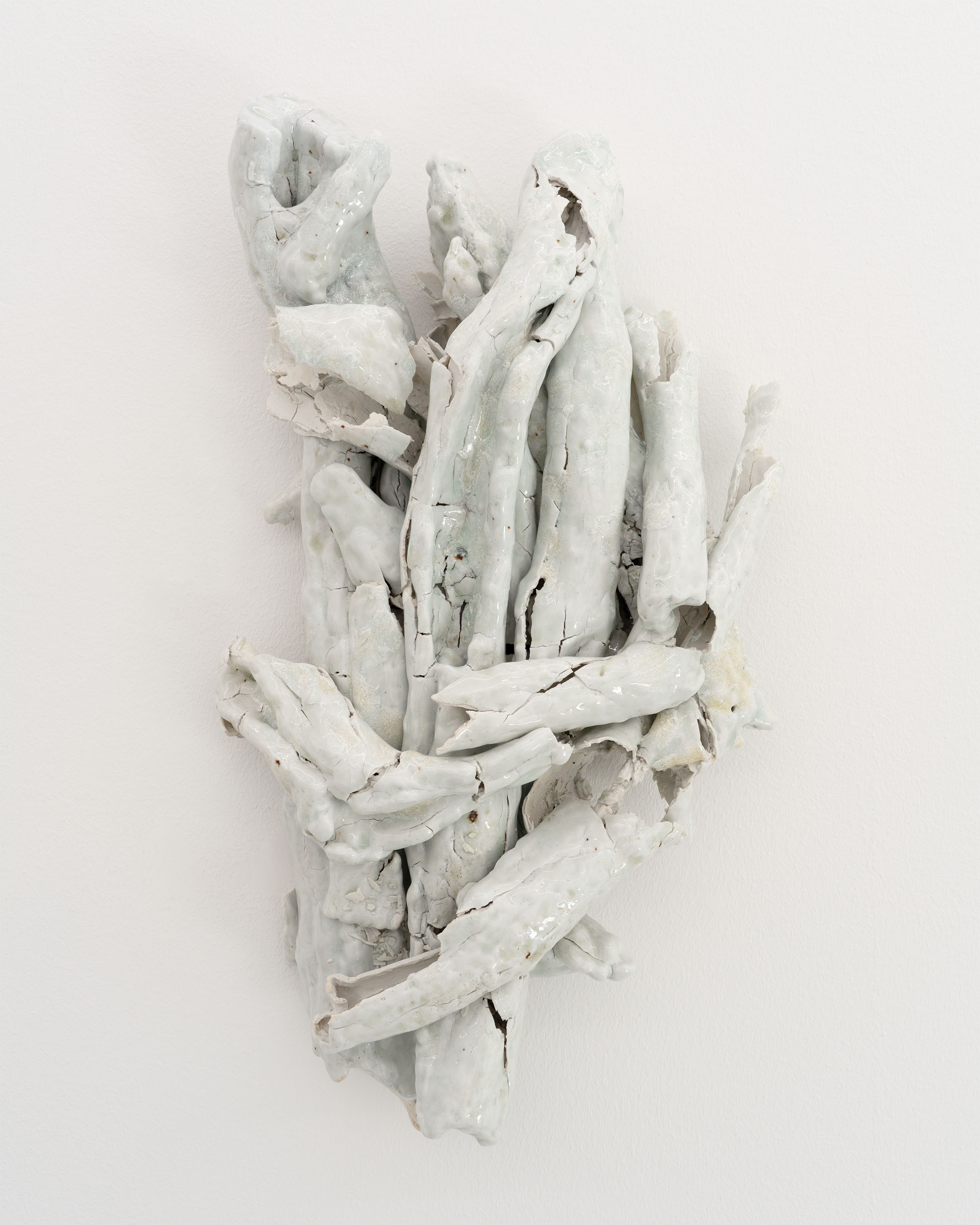 Ceramic Remains is a series of vertical ceramic sculptures formed by repeatedly coating organic materials, such as branches, with porcelain slip. During firing, the organic matter burns away, leaving behind hollow porcelain structures that resemble fossils or skeletal remains.The glaze is made from pure wood ash, collected from different types of trees, giving each piece a unique surface quality and mineral imprint.